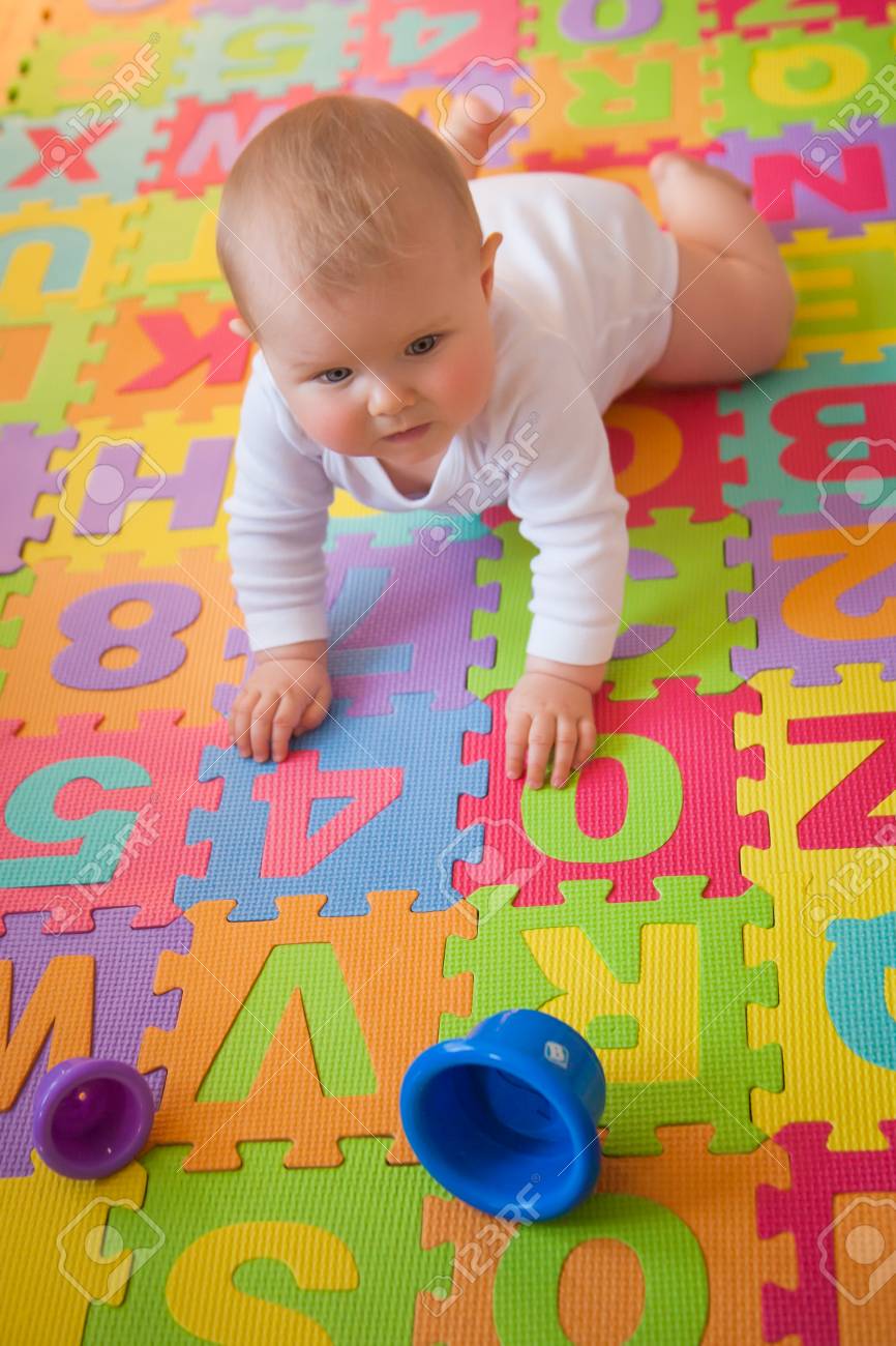 Smiling Baby Crawling On Alphabet Mat mats for babies learning to crawl