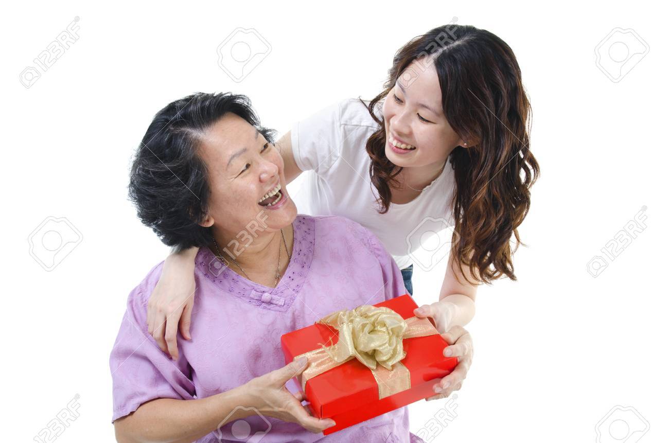 Birthday. Portrait Of Asian Senior mothers day gift from adult daughter