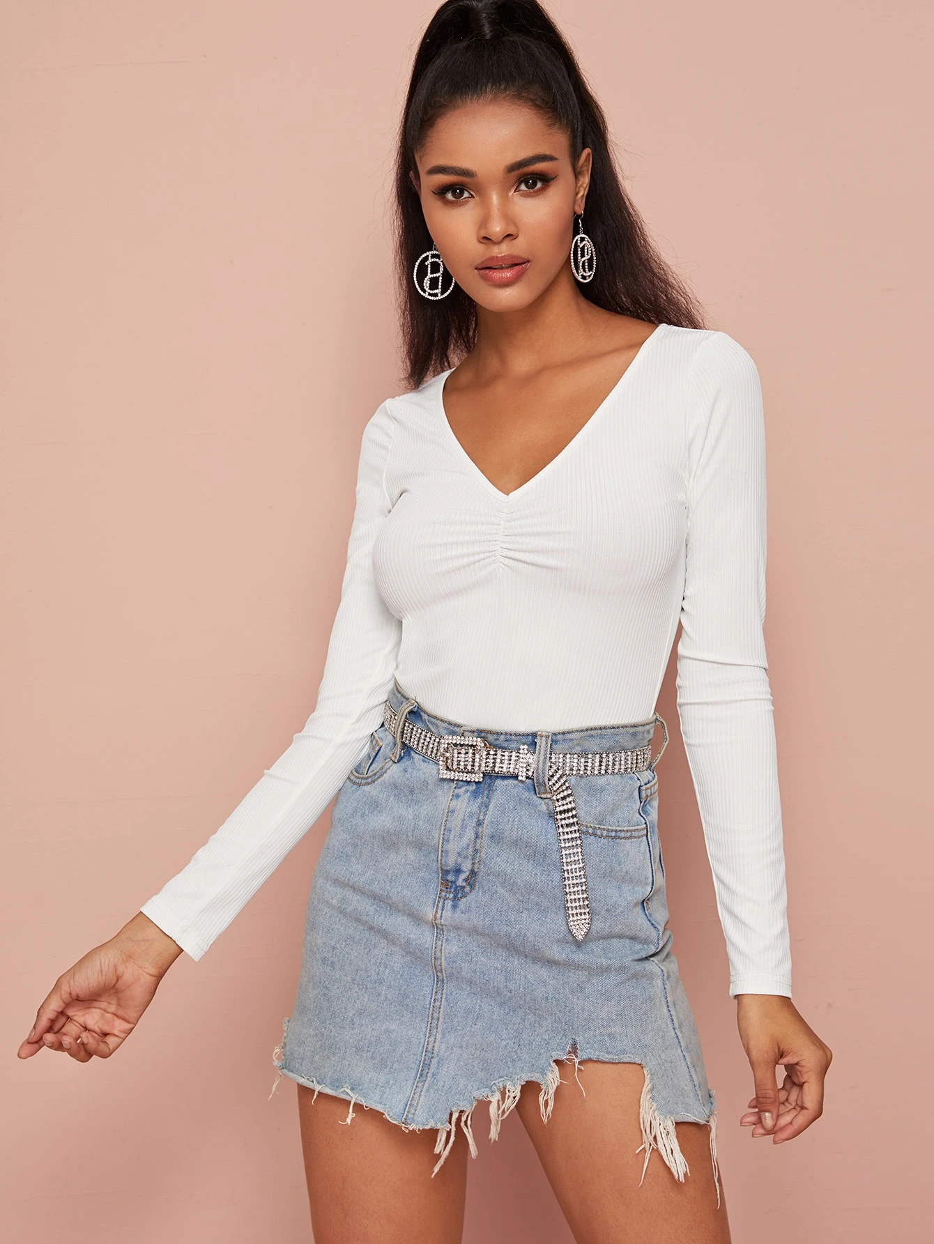 Ribbed Ruched Long Sleeve Top | SHEIN EUR ruched long sleeve top